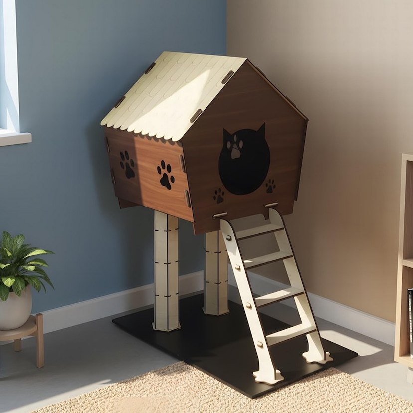 Kahverengi Ahşap Kedi Evi Merdivenli Özel Tasarım