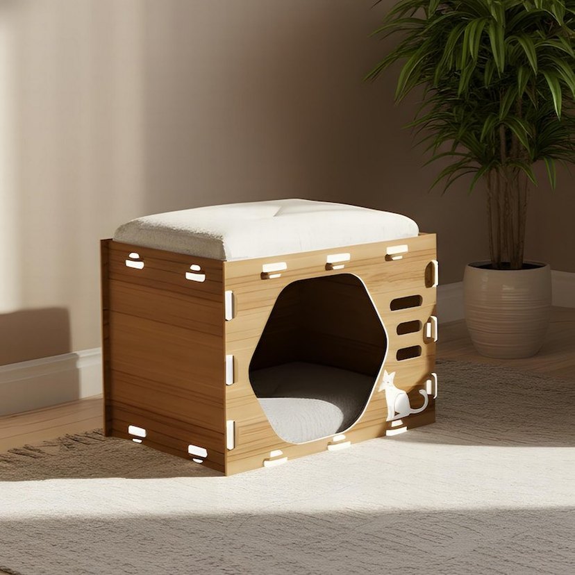Hafif kahverengi ahşap kedi evi, üstünde yumuşak yastık ve rahat iç kısmıyla evcil hayvanlar için konfor sağlar. Modern tasarımlı, küçük kedi figürlü.