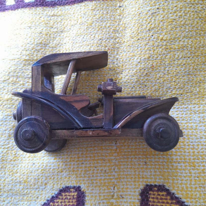 Koyu kahverengi ahşap oyuncak araba, detaylı işçilikle yapılmış nostaljik tasarıma sahiptir. Dayanıklı yapısı ve pürüzsüz tekerlekleriyle koleksiyon veya dekor için uygundur. Tek teker yok.