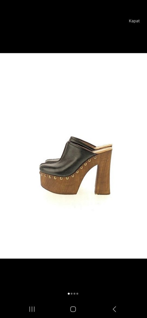 marka temsilidir Kahverengi, ahşap malzemeden yapılmış, tokalı ve parlak görünümlü platform topuklu ayakkabı. Vintage bohem tarzda, romantik akşamlar için uygun.