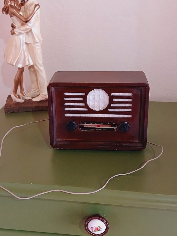 İki düğmeli, ortasında hoparlör ızgarası bulunan kahverengi ahşap retro müzik sistemi, renkli ayar göstergesine sahiptir. küçücük bir yazı var üzerinde köşe de eğer isterseniz boyayıp göndere bilirim .Çalışıyor bir sorunu yok komple ahşap