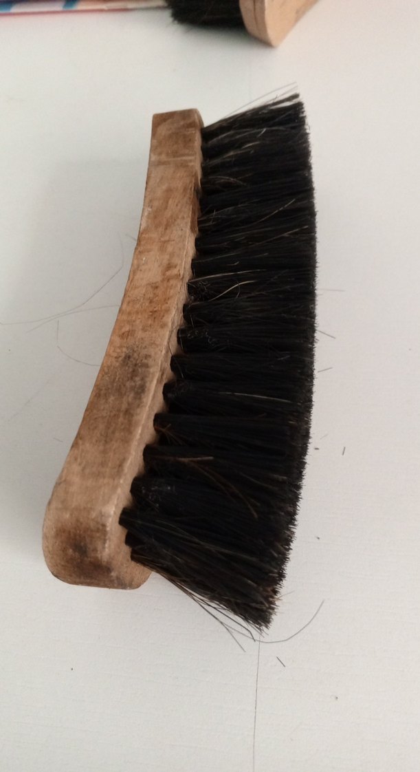 Kahverengi ahşap saplı ve yoğun koyu kıllara sahip ayakkabı fırçası, hassas uygulama için uygundur. ️Üzerinde neden dolayı deforme mevcuttur