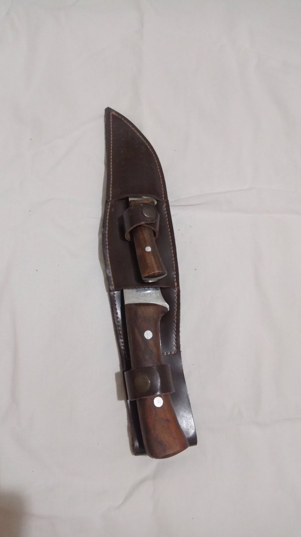 Kahverengi ahşap saplı, koruyucu deri kılıflı bıçak seti. ️