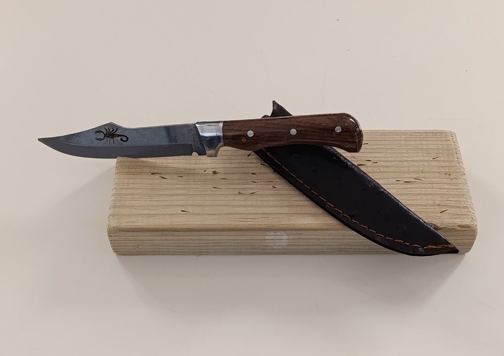 Koyu kahverengi ahşap saplı, keskin metal bıçak ve siyah kılıf içerir.