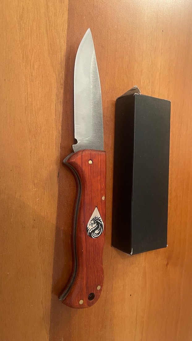 Keskin paslanmaz çelik bıçağa sahip, kahverengi ahşap saplı bıçak ve siyah kutu. ️