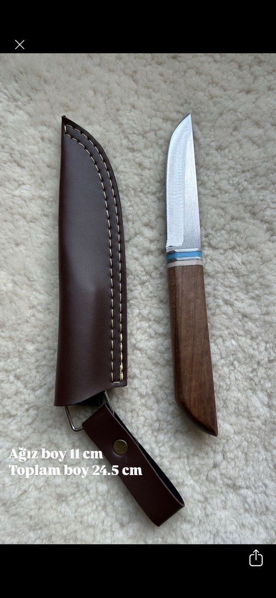 Koyu kahverengi ahşap saplı, 11 cm bıçak ağzı ve 24.5 cm toplam boylu bıçak, kahverengi kılıf ile birlikte.
