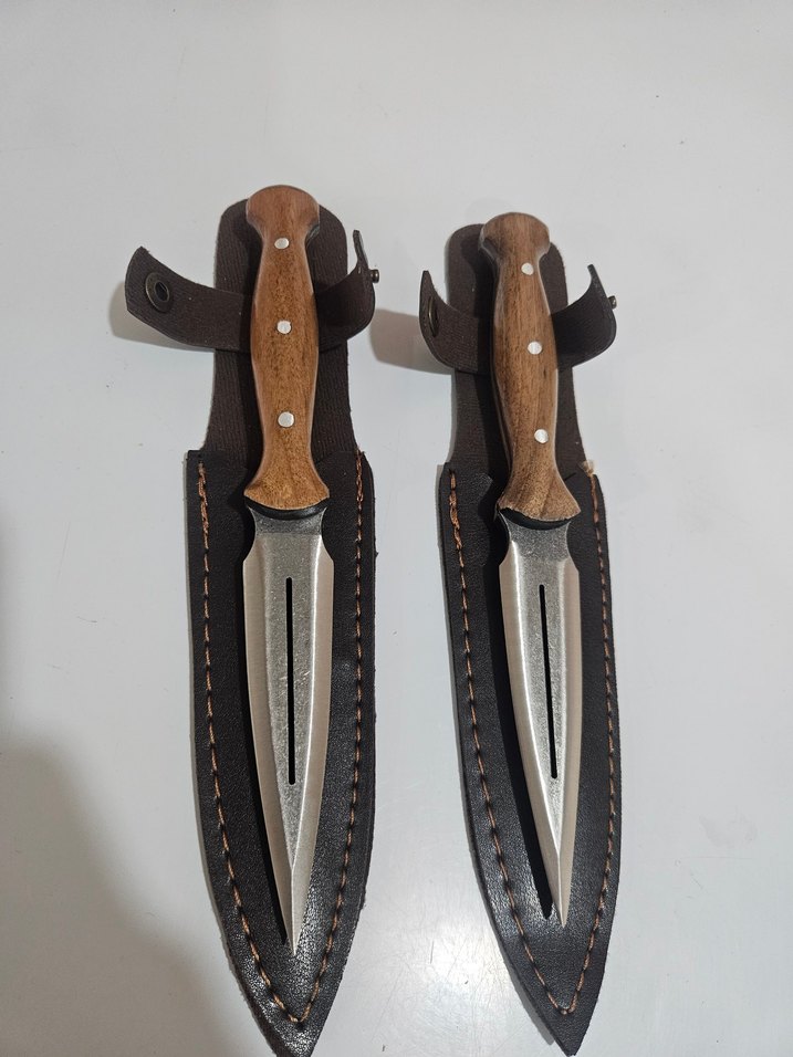 Kahverengi ahşap saplı iki adet bıçak, her biri uyumlu deri kılıf içinde. Bıçaklarda ortada oyuk desen bulunur. tane fiyatıdır.
