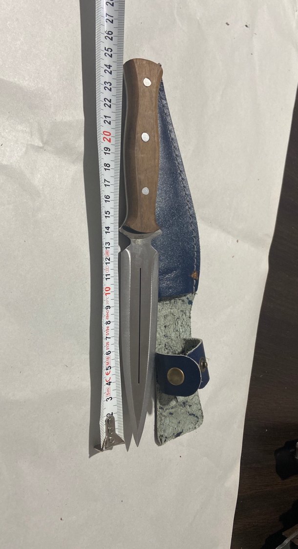 Kahverengi ahşap saplı, yaklaşık 22 cm uzunluğunda gri bıçak ve koruyucu kılıf içerir.