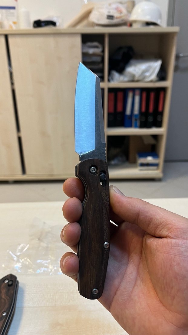 Keskin paslanmaz çelik bıçağa ve kolay tutuş sağlayan koyu kahverengi ahşap saplı katlanır bıçak.