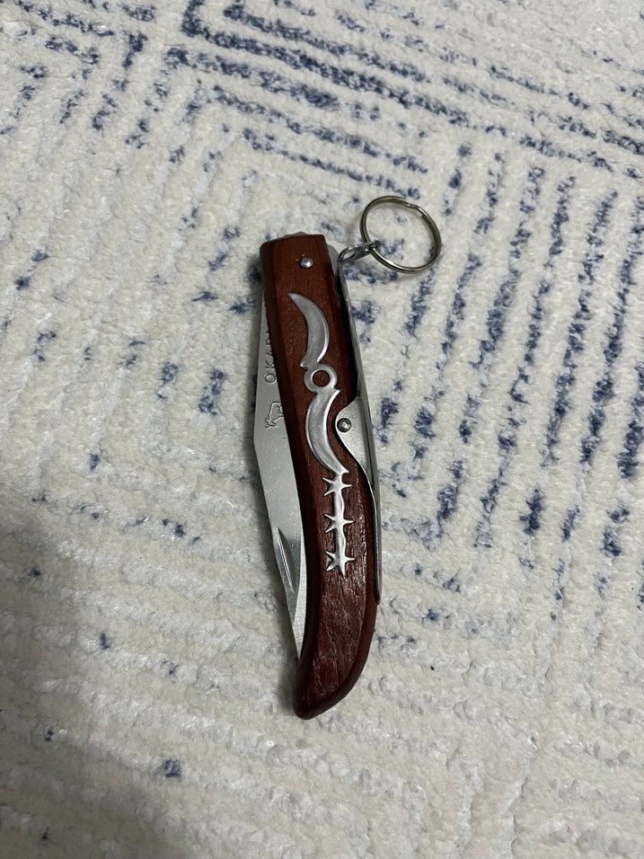 Koyu kahverengi ahşap saplı, metal süslemeli katlanır çakı, anahtarlık halkası ile taşımaya uygundur.