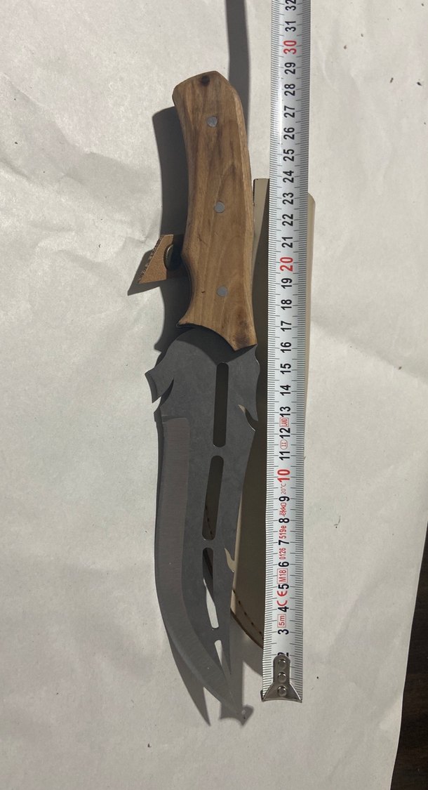 Kahverengi ahşap saplı, keskin ve delikli özel tasarım çelik bıçak. Yaklaşık 27 cm uzunluğundadır.