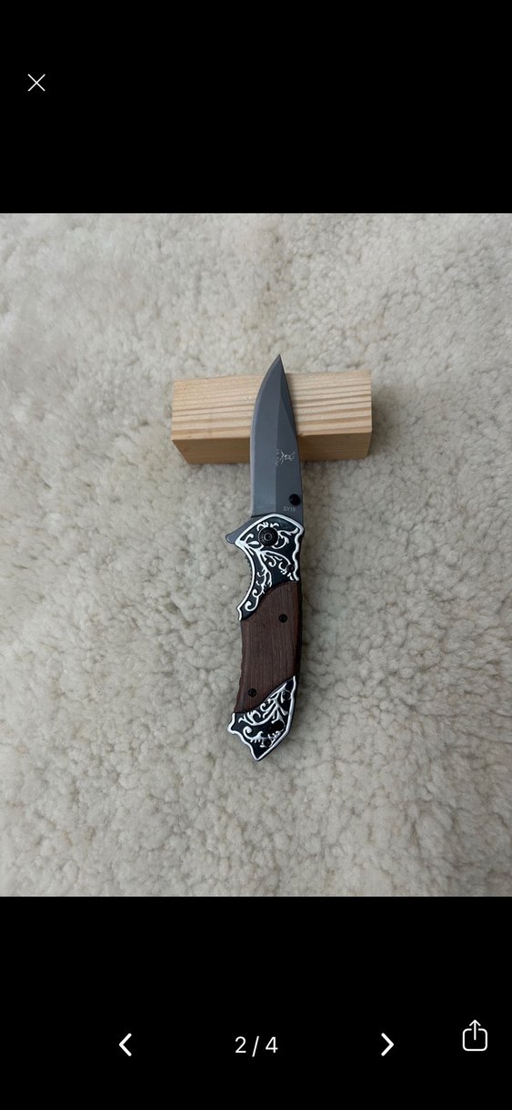 Kahverengi ahşap sapı oyma desenli metal detaylarla süslenmiş, keskin bıçağa sahip bir bıçaktır. ️