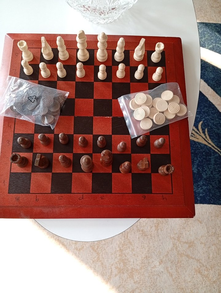 Koyu kahverengi ahşap oyun seti, satranç ve dama taşlarıyla birlikte, ekstra dama taşları poşet içinde yer alıyor. ♟️
