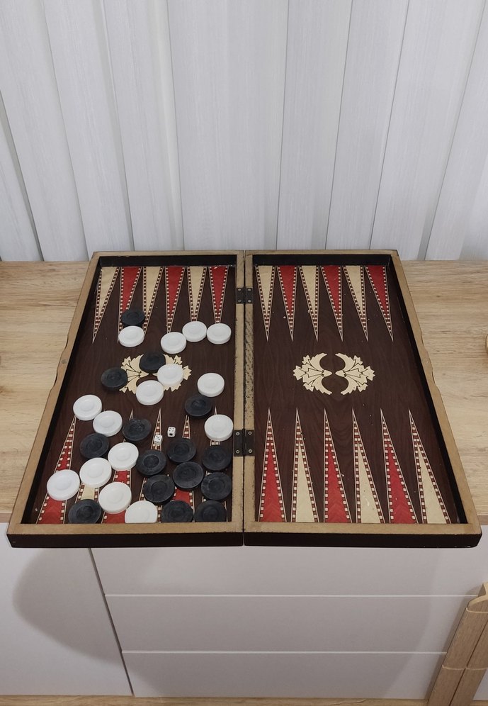 Kahverengi ahşap tavla takımı, geleneksel üçgen desenlere sahip olup siyah ve beyaz pul içerir. Katlanabilir tasarımı ile kolay saklanır.