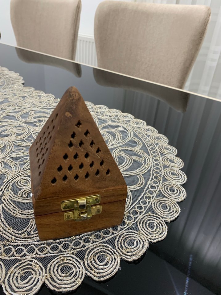Koyu kahverengi ahşap tütsülük , piramit şekilli ve delikli desenlere sahip, pirinç kilitli rustik bir tasarımdır. ️