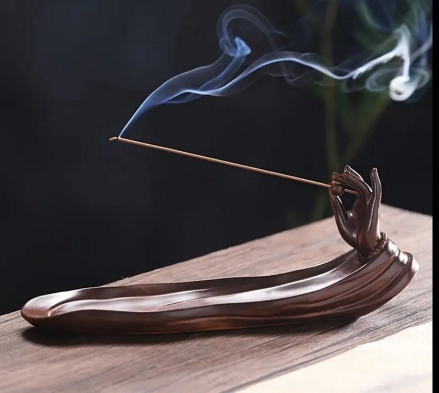 Kahverengi ahşap tütsülük, pürüzsüz ve kıvrımlı tasarıma sahip, tütsü çubuklarını güvenle tutar. ️