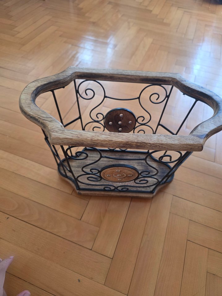 Kahverengi ahşap çerçeve ve metal süslemelere sahip koyu renkli rustik tasarımlı sepet Düzenleme veya dekorasyon için uygundur.