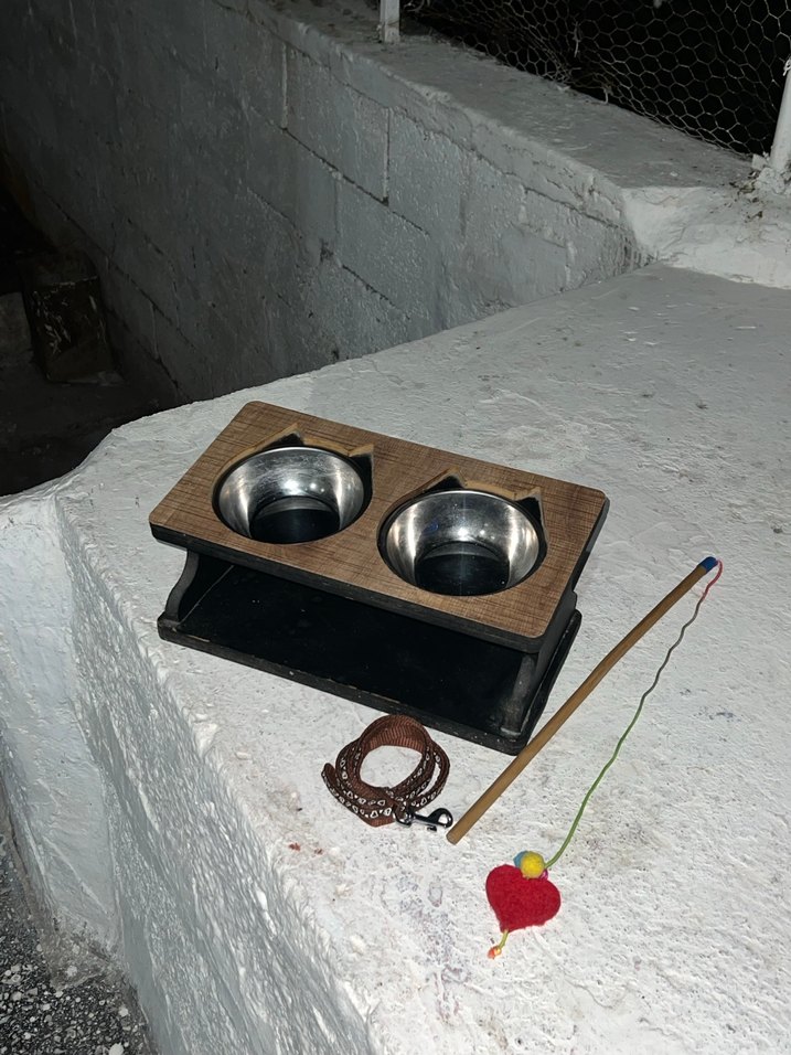 İki metal kase, kahverengi ahşap çerçevede yer alır. Kedi maması için uygundur. Kırmızı kalp ve renkli ponponlu kedi oyuncağı ve taşması da dahildir