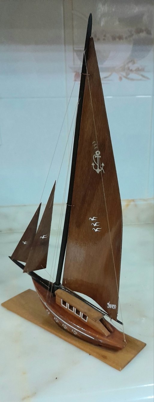 Koyu kahverengi ahşap yelkenli figür, detaylı yelkenler ve küçük çapa simgesi ile 444 numarası bulunur. ⚓