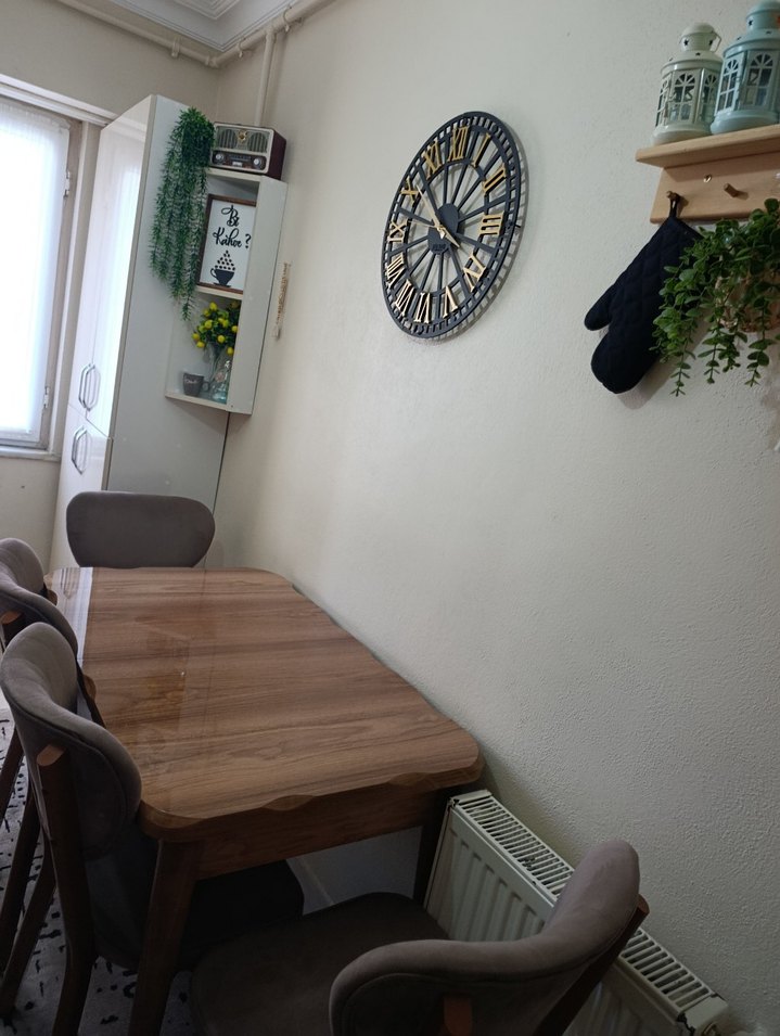 Kahverengi ahşap yemek masası, sıcak bir yemek alanı oluşturuyor. 9aydir alınmış taşınmadan dolayı satılıktır bir çizik dahi yok yer İstanbul