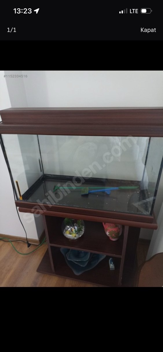Kahverengi akvaryum, iki raflı stand ile birlikte. Cam tank, su canlıları için geniş ve şeffaftır. 78 Boy 38 En 50 Derinlik 200 L Sadece akvaryum 2500 TL