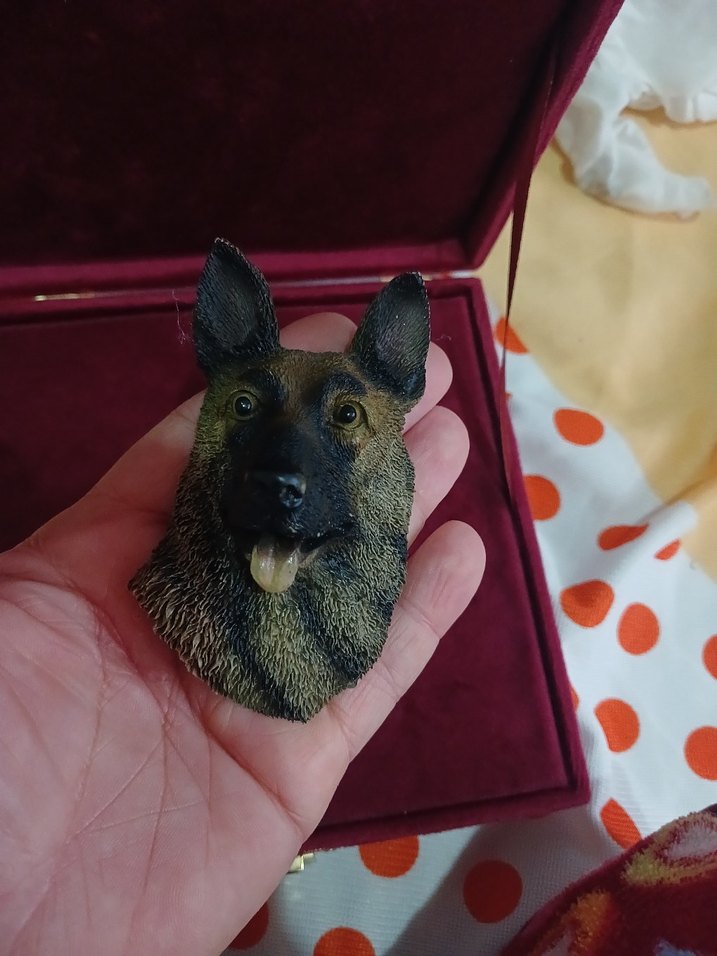 Alman Kurdu köpeğinin başını ve dilini gösteren detaylı kahverengi figürin. et bebek mahzemesinden tertemiz
