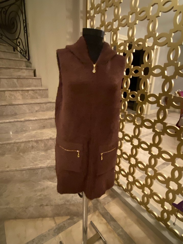 Kahverengi angora uzun yelek, yüksek yakalı ve fermuarlı ceplerle rahat ve bol kesim sunar. Kolsuz tasarım günlük kullanıma uygundur.