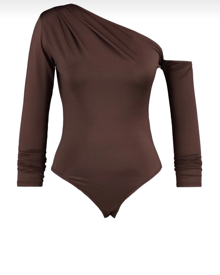 Kahverengi, satenimsi kumaştan, drapeli ve asimetrik tek omuz detaylı, uzun kollu, v yaka, vücuda oturan modern kadın body
