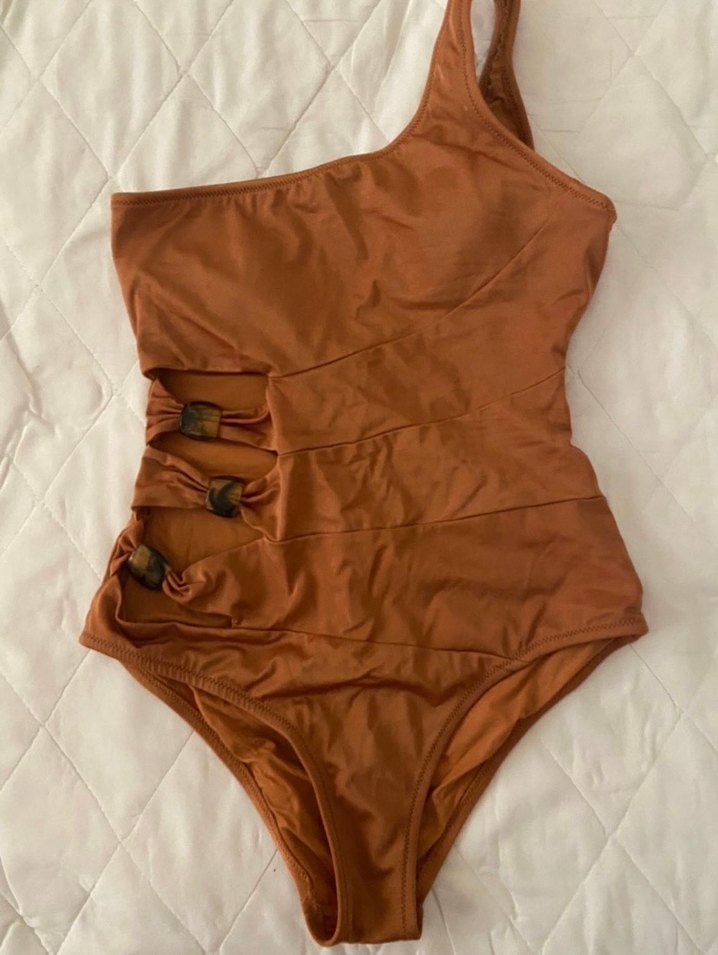 Kahverengi, tek omuzlu, kemerli detaylı, vücuda oturan sade bohem tarzda mayo. ️