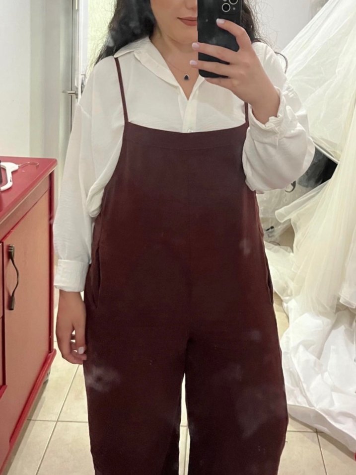 Bordo askılı, bol kesim midi tulum. Paçası yırtmaçlı. Günlük kullanım için rahat ve şık bir parça. Bir kez giydim.