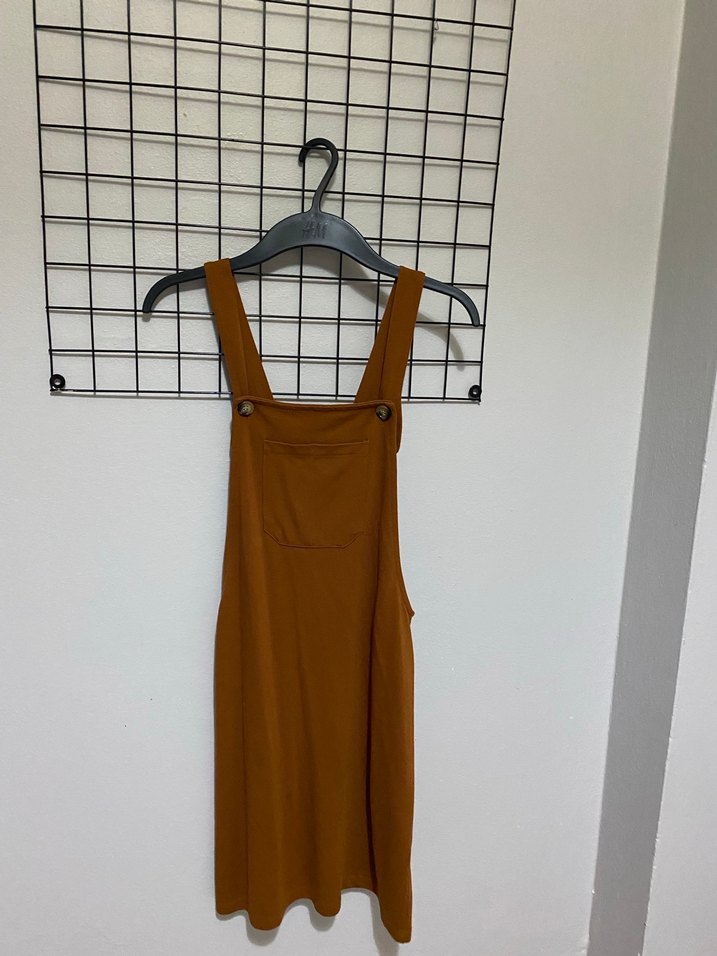 Yüksek yakalı, askılı ve vücuda oturan midi boy elbise, yumuşak sentetik kumaştan yapılmıştır. Kahverengi renkte ve kemer detaylıdır, günlük sokak stiline uygundur.