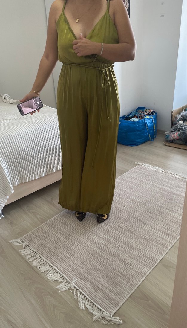 Kahverengi askılı, straplez yaka ve kuşaklı, salaş kesim ve parlak kumaştan günlük kullanım için uygundur.