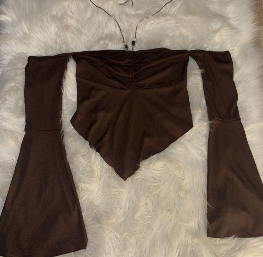 Kahverengi, boncuk detaylı straplez bluz, uzun kollu ve vücuda oturan crop kesime sahip. Yumuşak sentetik kumaştan, midi boy ve rahat bohem tarzda.