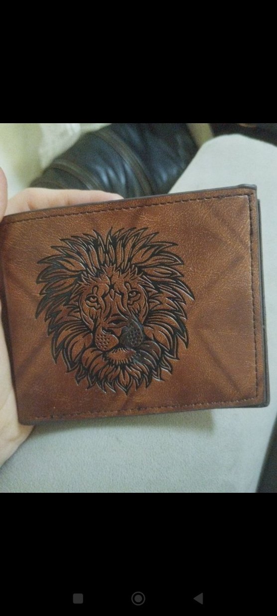 Kahverengi erkek cüzdanında aslan baskısı bulunur, yumuşak dokulu ve bohem-minimalist tarzda tasarlanmıştır.