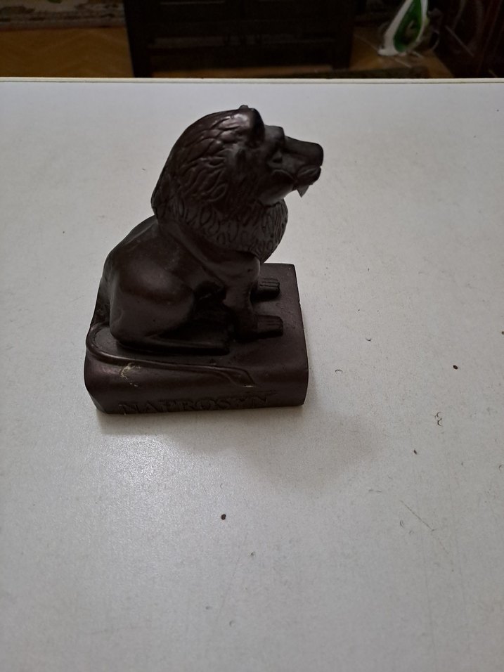 Kahverengi ve koyu tonda, detaylı yeleli aslan figürini, dikdörtgen bir taban üzerinde oturuyor.