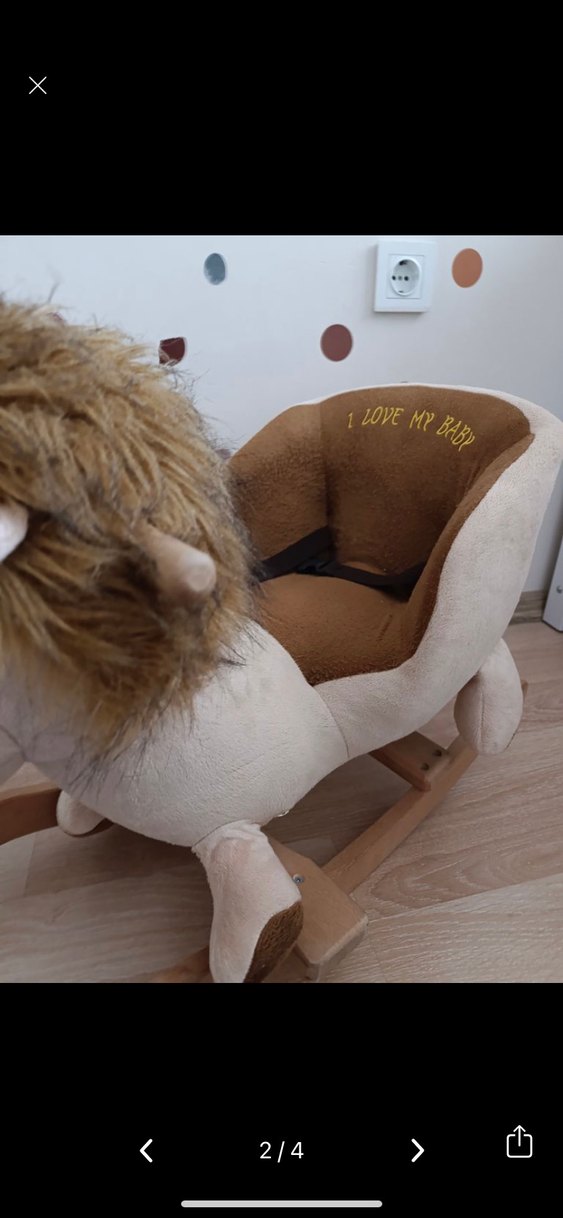 Yumuşak dokulu kahverengi ve gri aslan figürlü peluş oyuncak, üzerinde 'I LOVE MY BABY' nakışlı rahat oturma alanı içerir.