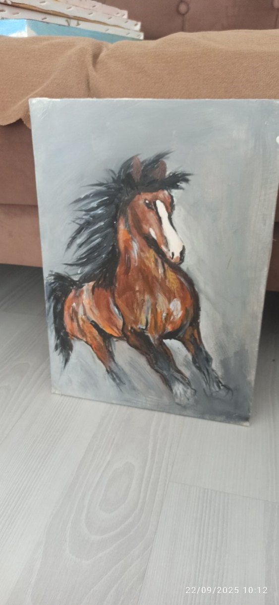 Koyu kahverengi atın hareketli fırça darbeleriyle resmedildiği tablo, nötr bir arka plan üzerinde yer alıyor. 25-35