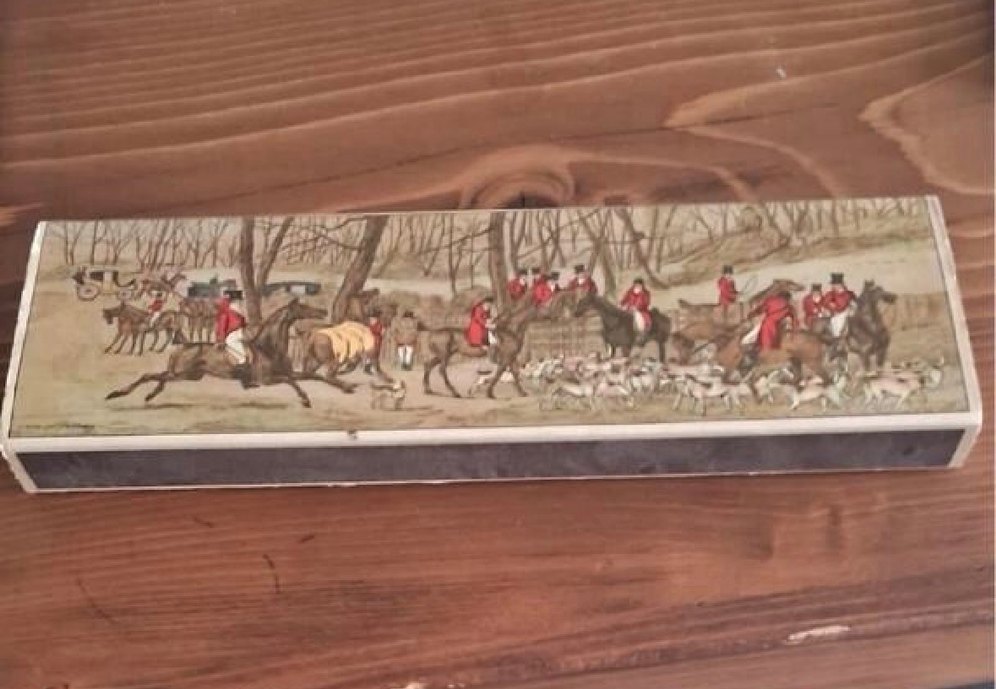 Koyu kahverengi tonlarda, kırmızı ceketli avcılar, atlar ve köpeklerin bulunduğu geleneksel bir av sahnesi tablosu. ️