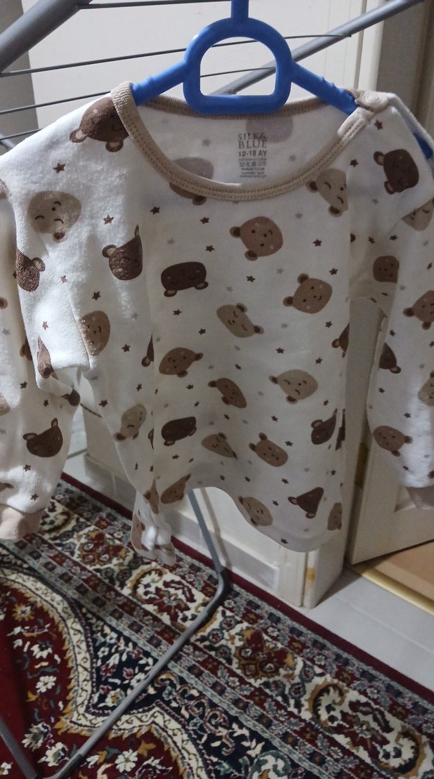 Yumuşak kumaştan, krem zemin üzerinde açık kahverengi ayı yüzü desenli, uzun kollu çocuk içliği. 12-18 ay yaş aralığı için uygundur.