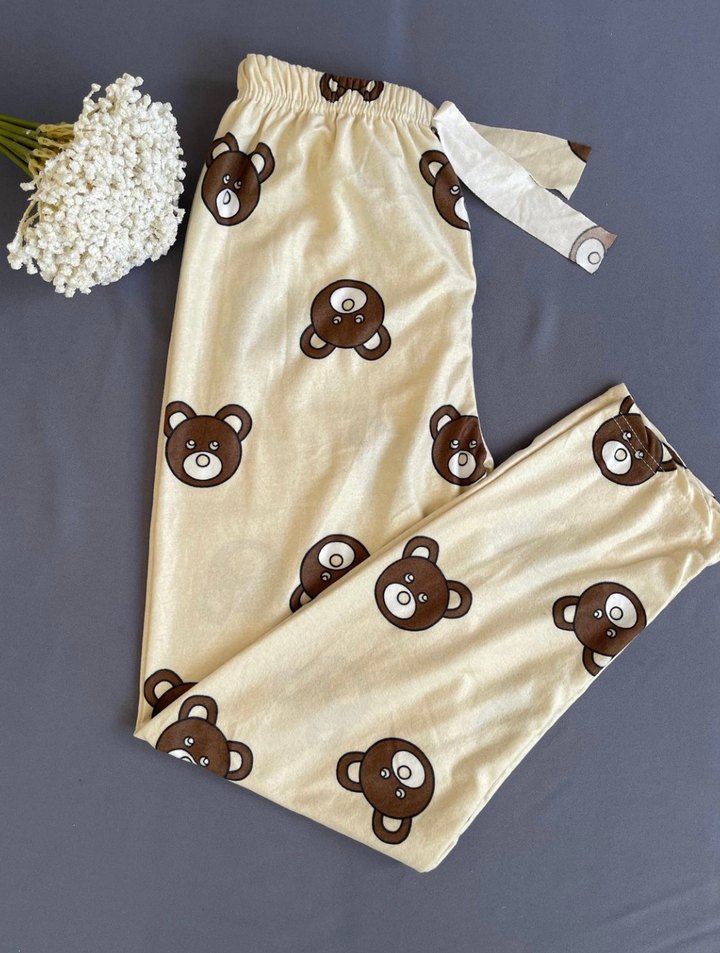 Parlak kahverengi kumaş üzerinde baskılı ayı desenleri bulunan, bol kesim kadın pijama altı. Rahat ve konforlu kullanım sağlar.