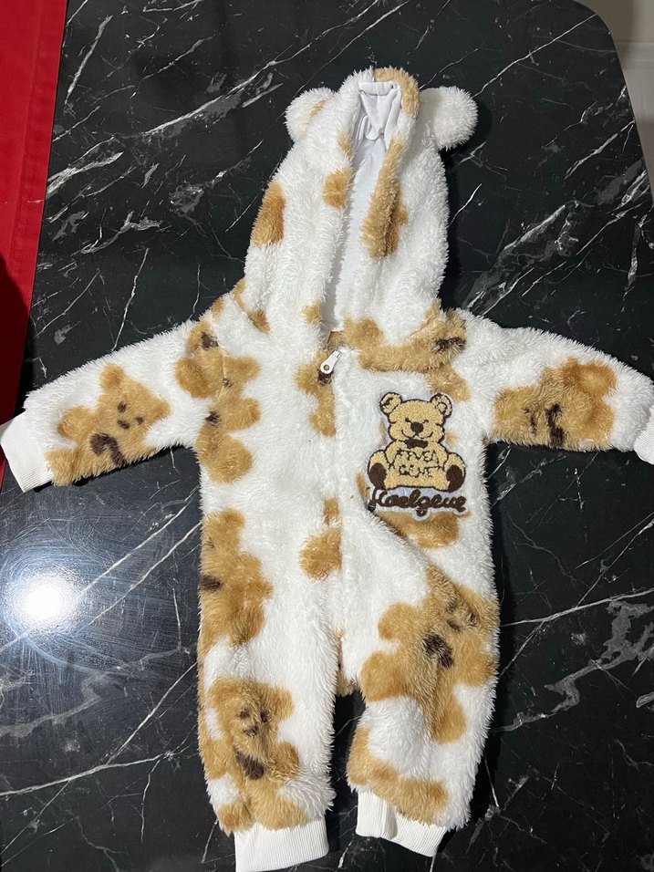 Yumuşak ve sıcak kumaştan, kapüşonlu ve cepte kürk detaylı, ayıcık desenli kahverengi bebek tulumu. Önden fermuarlı ve manşetli. 3-6 Ay Bebek Peluş Tulum/Mont