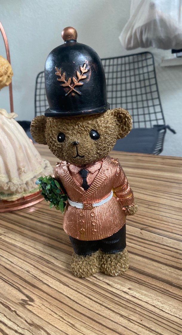 Kahverengi ayıcık figür, dokulu yüzeye sahip; parlak kaban, siyah kravat ve yaprak desenli siyah uzun şapka takıyor. Küçük yeşil buket tutar. Porselen