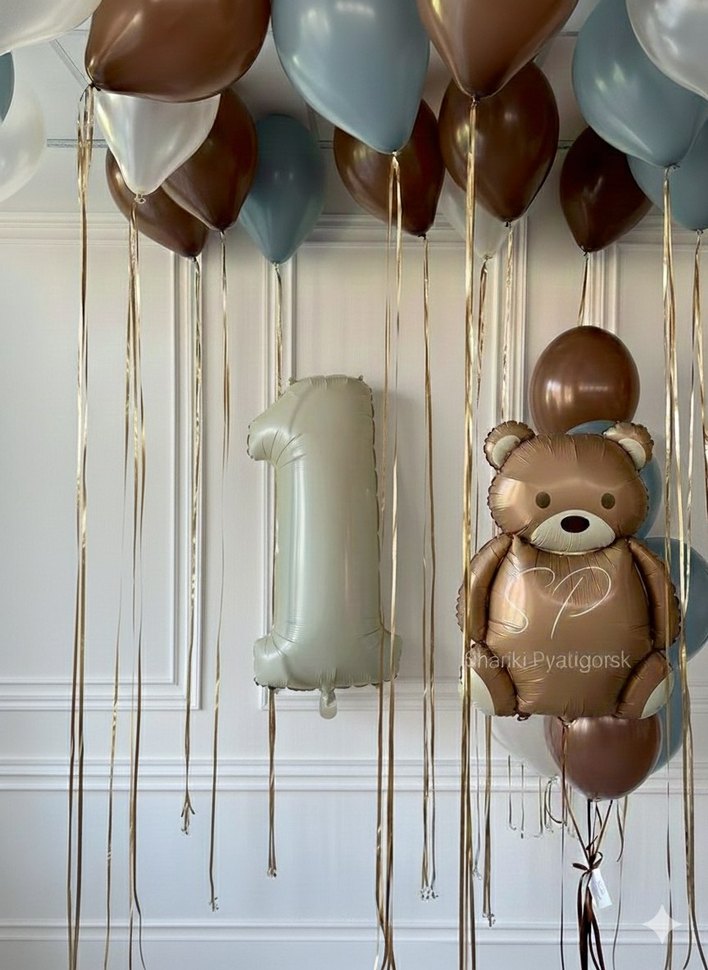 Açık kahverengi ve gümüş balonlar, büyük 1 rakamı ve ayıcık şeklinde balon içerir. Kutlamalar için uygundur, iplerle asılabilir. ayıcık balon 1 yaş balon 31 adet balon mavi beyaz kahverengi 5 metre Gold rafya