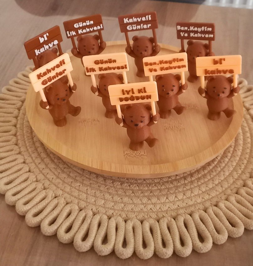 Kahverengi ayıcıklar, kahve temalı küçük tabelalar tutuyor, dekorasyon veya hediye için uygundur. 3d yazici ile yapilmistir fiyatlar adet fiyatıdır