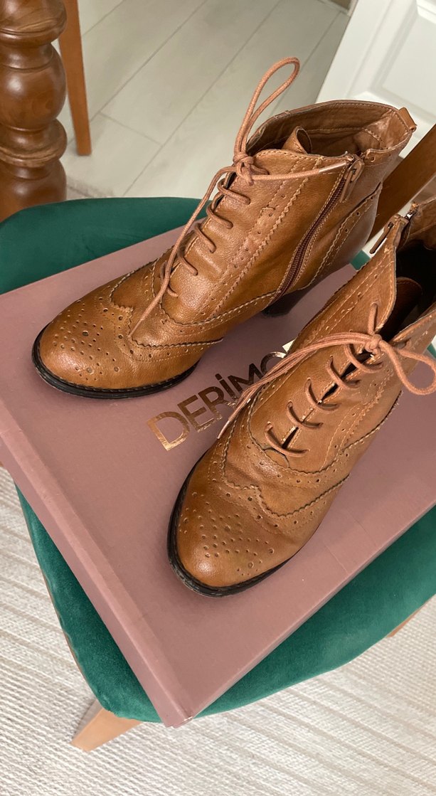 Kahverengi kadın bot topuklu ve bağcıklı. Vintage bohem tarzı, ofis kullanımı için uygun. Desensiz klasik görünüm.