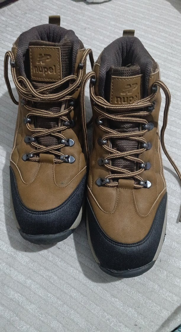 Nupel markalı, kahverengi kauçuk ve gri detaylı bağcıklı erkek bot, dış mekan kullanımı için uygundur.