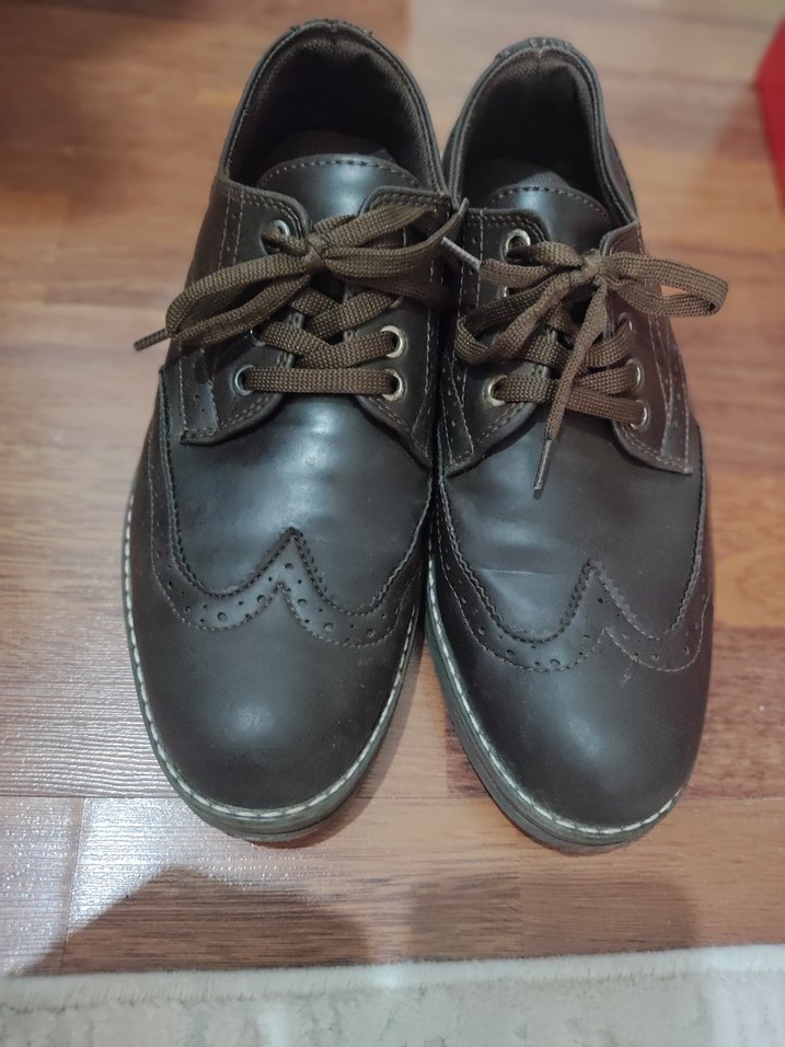 Koyu kahverengi, bağcıklı erkek klasik ayakkabı, pürüzsüz yüzey ve dayanıklı kauçuk tabanlı, günlük rahat kullanım için uygun. Sayılı giyilmistir. Herhangi bir deformesi yok. Hakiki deridir.