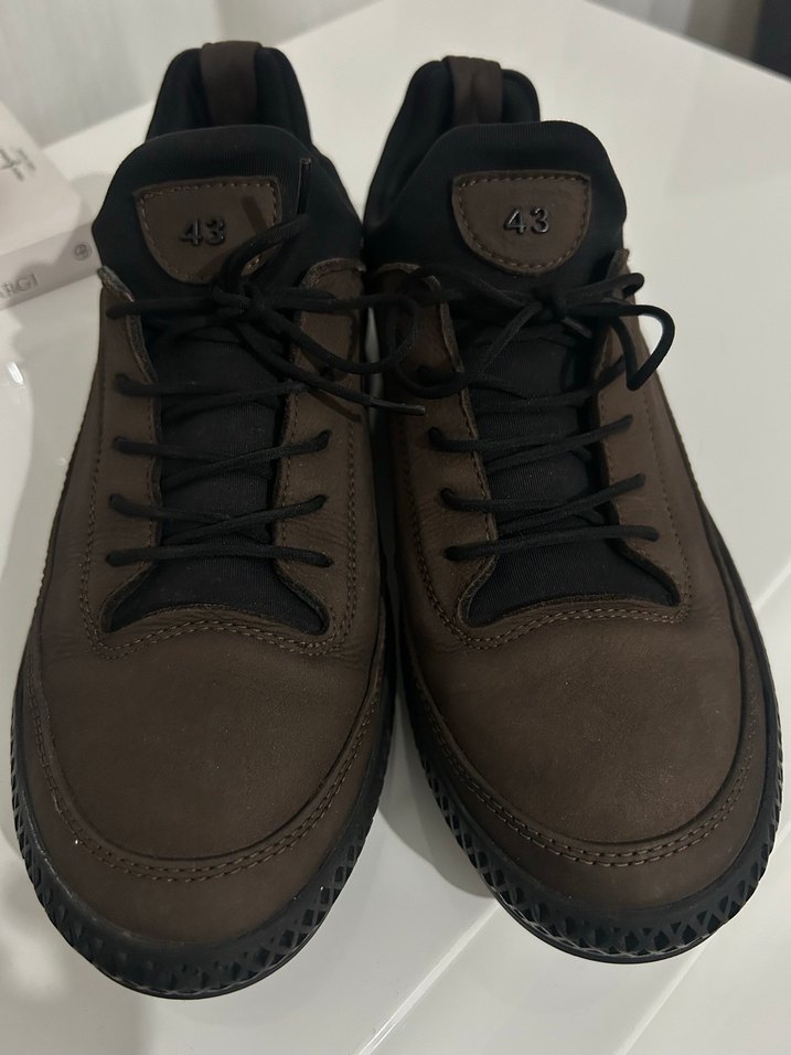 Koyu kahverengi kauçuk tabanlı, bağcıklı erkek outdoor ayakkabısı, 43 numara. Günlük rahat kullanıma uygun, sokak athleisure tarzında. Hakiki süet deri ve orijinal olup en ufak sorunu yoktur. Bir kaç kez giyilebildi ayağa dar geldiği için satıyoruz.