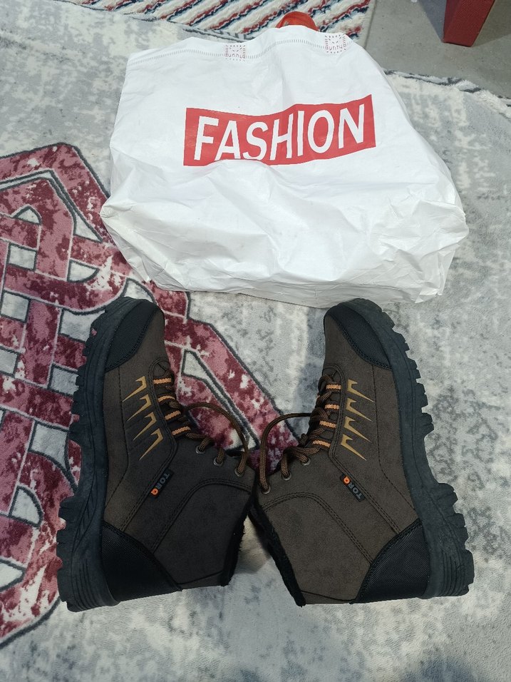 Kahverengi süet erkek outdoor bot, bağcıklı ve baskılı detaylı, gri tabanlı, sokak stili için uygun. "FASHION" yazılı beyaz torba ile birlikte.