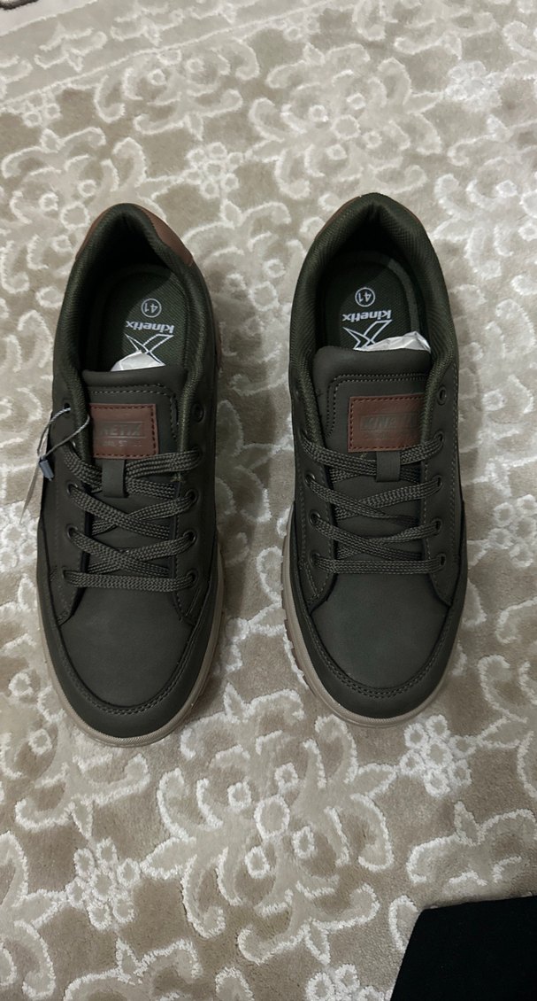 Kinetix marka haki yeşil renginde ve kahverengi tabanlı erkek sneakers, bağcıklı tasarıma ve kauçuk malzemeye sahiptir, sokak stiline ve günlük kullanıma uygundur.